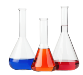Four glass laboratory flasks filled with orange liquid for scientific research transparent background