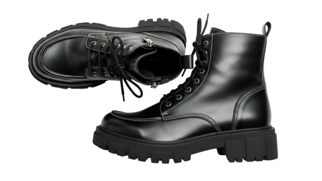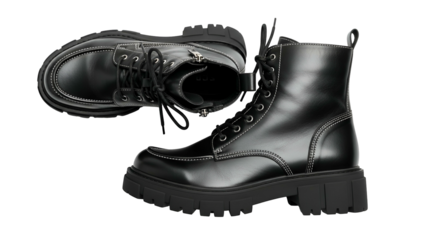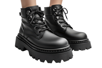 Trendy black lace-up boots with chunky soles on transparent background