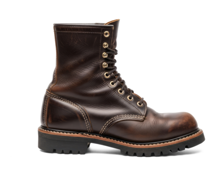Side view of a sturdy leather work boot with intricate stitching and rugged sole design isolated