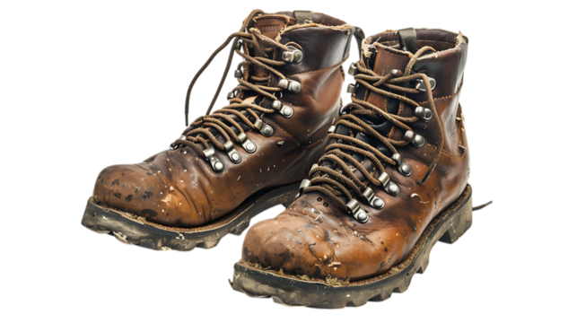 A pair of worn leather hiking boots with metal eyelets and tied laces on a transparent surface