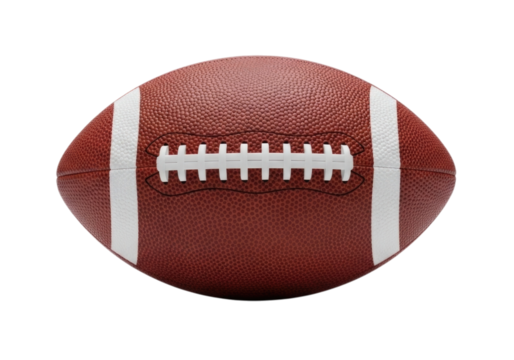 Brown leather American football with prominent white laces, showcasing its textured surface and design on transparent background.
