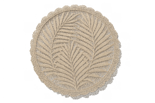 Round beige lacework doily with palm leaf embroidery creating an elegant decorative textile element
