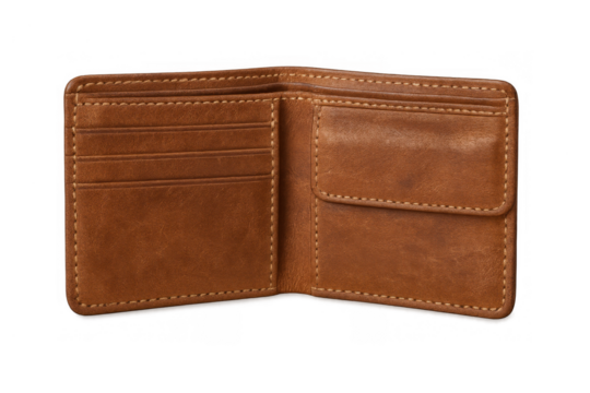 Person holding an empty black leather wallet open in their hands showing no money inside isolated on transparent background