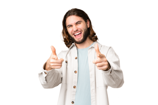 Young caucasian chef over isolated chroma key background pointing to the front and smiling