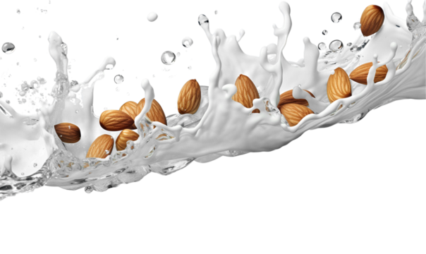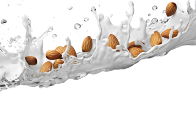 Two almonds Splashing in Plant-Based Milk Isolated on transparent background.