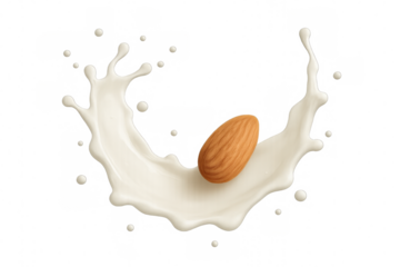 Floating almond suspended in creamy plant milk splash, realistic rendering against transparent backdrop, ideal for dairy-free marketing