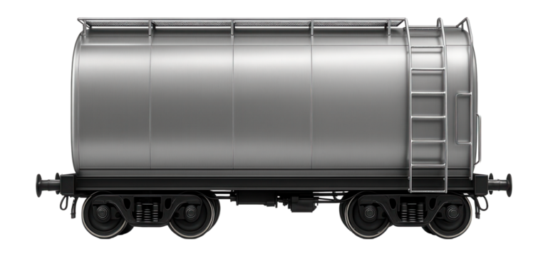 A modern galvanized steel grain silo stands tall against a solid transparent background, featuring a conical roof, access ladders, and safety railings. background removed