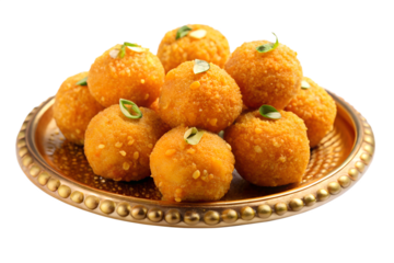 A ceramic plate filled with traditional Indian sweets laddus with nuts and green herbs isolated on transparent background