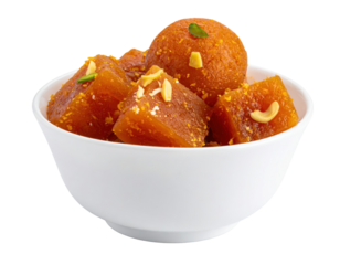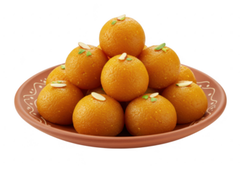 Traditional indian laddoo in brown bowl with halved cashews on transparent background
