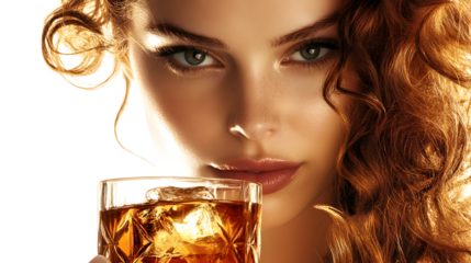 Smiling mature woman drinking champagne standing over transparent background. Celebration concept. PNG transparent.