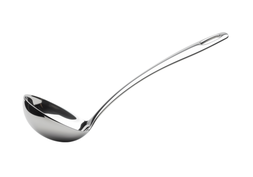 Elegant Silver Ladle: Kitchen Utensil, Polished Metal, Serving Spoon on white background