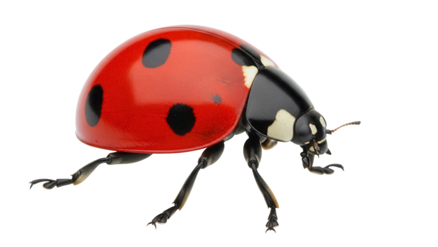 A ladybug crawling, showcasing its red and black spotted exoskeleton, against a transparent background, ladybug on white background