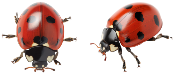 Close up of a vibrant red ladybug with black spots on a stark on transparent background