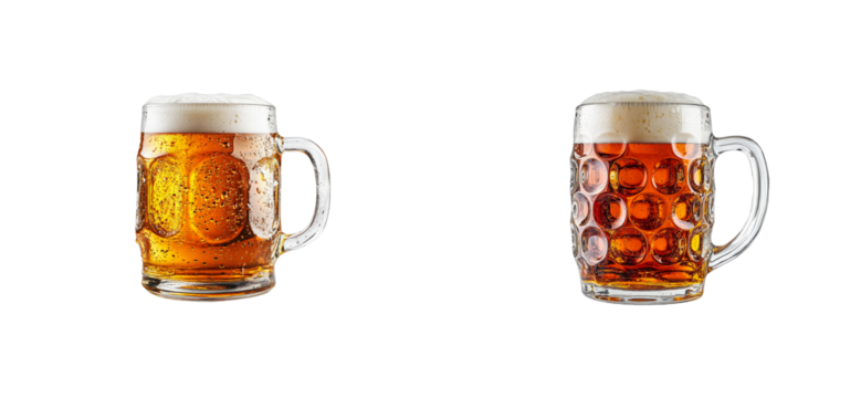 Glass mug filled with amber beer and frothy foam isolated on transparent background