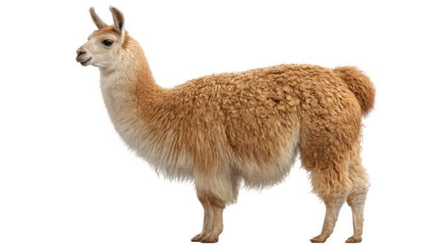 llama standing in side profile, soft brown woolly coat, domesticated Andean mammal, isolated on white background