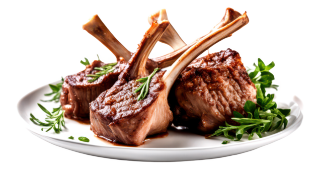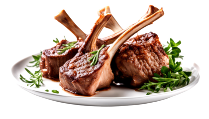 Deliciously grilled lamb chops served on a white plate isolate on transparent background, cutout, png