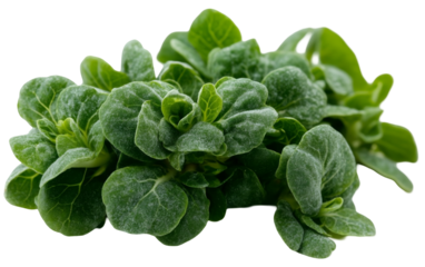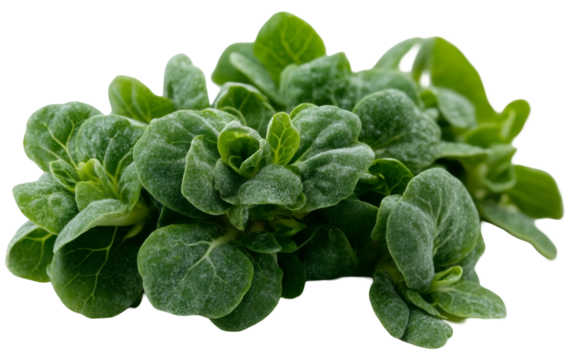 PNG object on clear backdrop. Close up of fresh lamb's lettuce leaves, displaying their tender texture and vibrant green color. Isolated on transparent background.