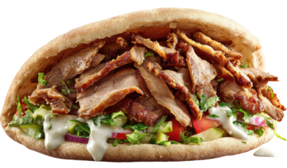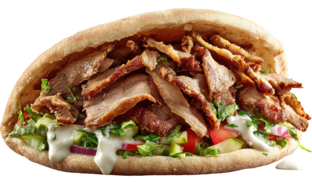 A generously filled pita with shaved meats, crisp greens, and creamy sauce