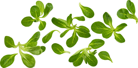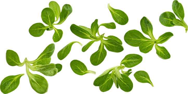 Lamb's lettuce falling isolated on white or transparent background. PNG