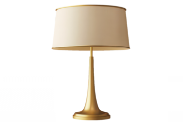 Golden floor lamp with a beige lampshade and decorative base isolated on a transparent background vintage