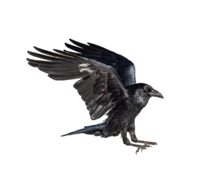 A beautiful raven (Corvus corax) in flight isolated on transparent background