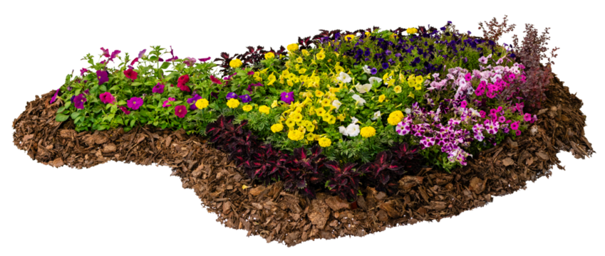 Isolated landscape design element with soil covered in bark mulch and colorful natural garden flowers.