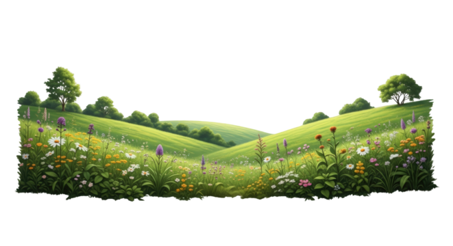 Vibrant Meadow with Rolling Green Hills and Wildflowers nature landscape summer spring outdoors scenic rural countryside colorful flora vegetation grass