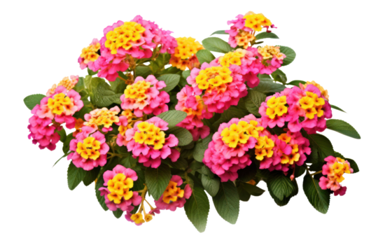 Vibrant pink and yellow lantana bush, with the delicate clusters of flowers clearly visible isolated on a white background