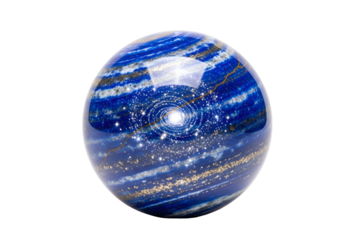 A detailed, round sphere crafted from lapis lazuli, showcasing a depiction of celestial bodies and patterns, exuding a sense of wonder and deep cosmic beauty.