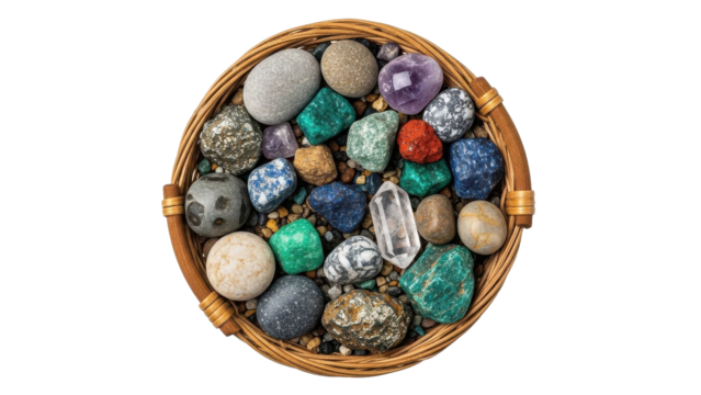 Gemstones: A collection of polished gemstones, each with unique colors and shapes, showcased against a white background. Gemstones are perfect for jewelry-making, crafts, and interior design.