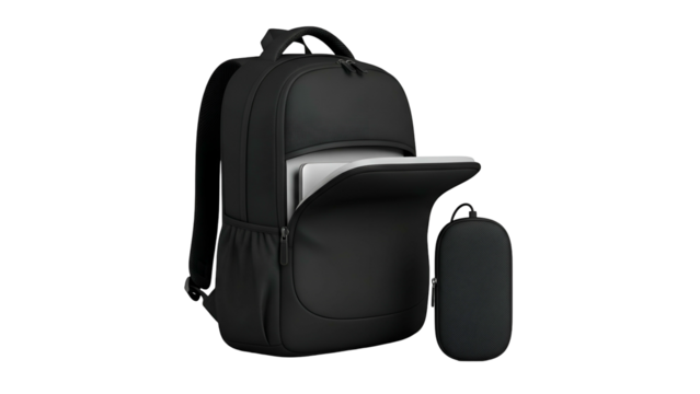 Black, sleek backpack with a partially open laptop compartment, and small matching pouch