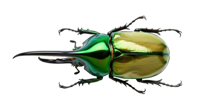 Isolated Rhinoceros beetle, shiny iridescent insect with large horn, nature and entomology