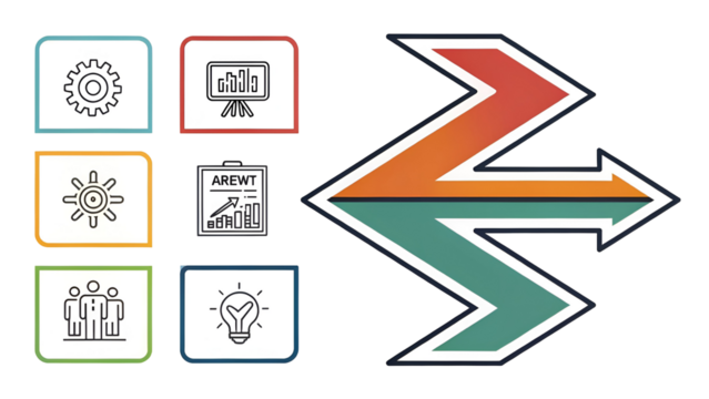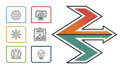Business process diagram showing six core concept icons and a large zigzag arrow indicating flow and transformation