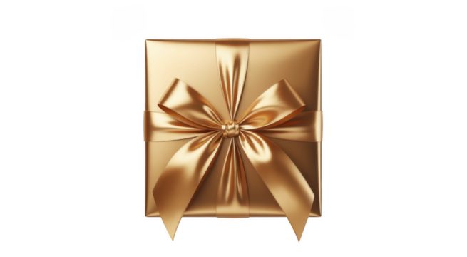 Gold gift box with large textured ribbon bow against transparent background