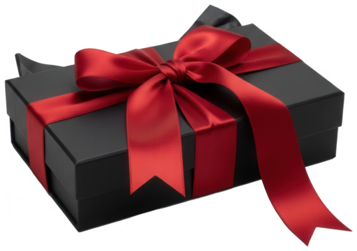 A rectangular gift box wrapped in white paper featuring a subtle grey and black floral pattern, adorned with a large, vibrant red satin ribbon forming a, isolated on transparent background.