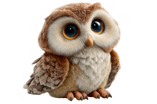 A small, fluffy owl with large, curious yellow eyes, isolated on a transparent background