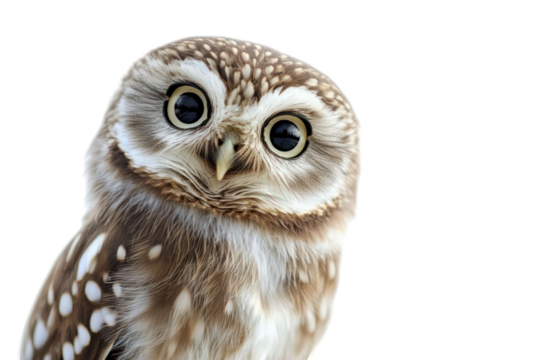 Close-up of a curious owl with large eyes and brown and white feathers on transparent background. The owl gazes directly at the viewer with intent