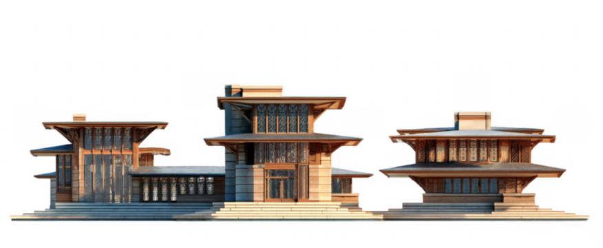 Modern wooden architectural complex with multiple layered flat roofs and large