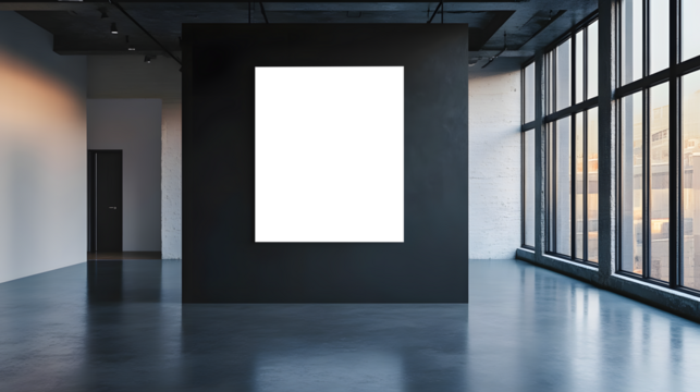 Modern gallery space with blank poster on dark wall and large windows displaying city skyline