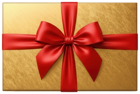 Valentine PNG, Golden gift box and ribbon with a large ornate bow, angled perspective on a transparent background