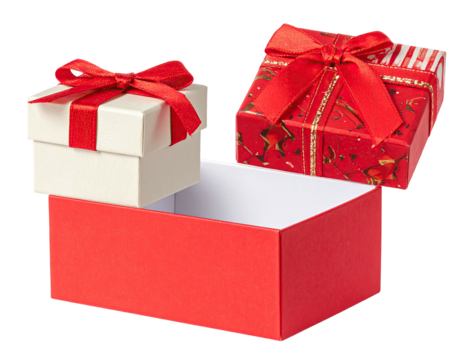 Stylized gift box with cream ribbons and star motifs on transparent background