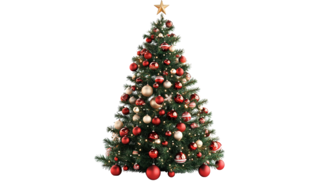 Large white gift box with a big red ribbon bow on top, decorated with pine tree branches and two red Christmas baubles. Festive holiday present isolated on a Transparency background