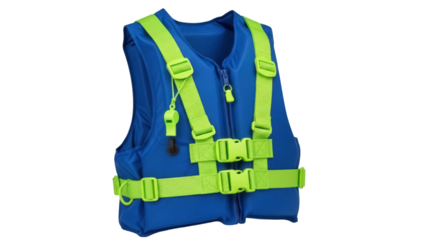 Isolated blue life jacket with fluorescent green straps and buckle for kids safety at sea