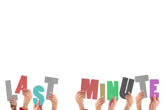 Last minute reminder text with open hands on transparent background