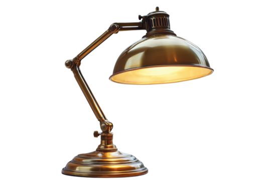 Elegant brass desk lamp illuminates workspace near window in a cozy indoor setting during late afternoon light