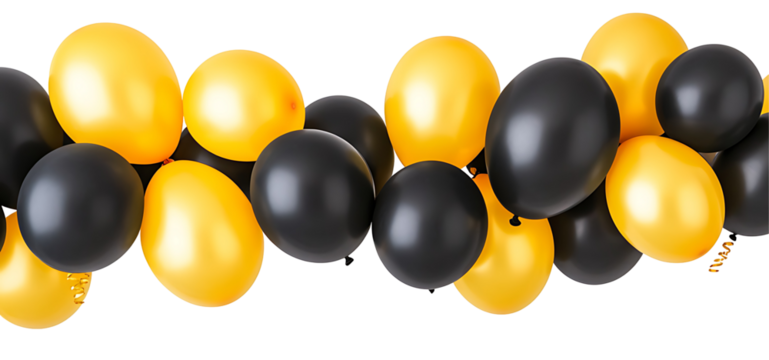 A bunch of black and gold balloons clustered together against a stark black background for celebration