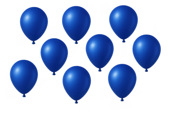 Deflated, dull, shrivelled muted blue and soft gray latex balloons with tangled strings, scattered on a transparent background with copy space, soft studio light, post-party melancholy atmosphere