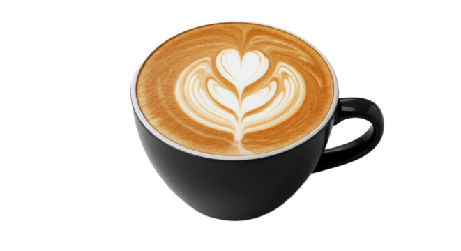 Latte art in a brown ceramic cup isolated on transparent background, coffee drink with heart and leaf pattern for cafe menu PNG