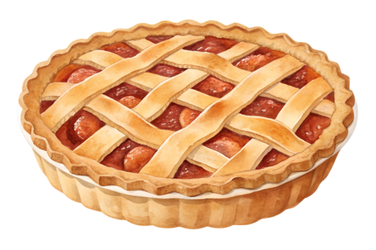 Watercolor lattice pie with golden crust and sweet filling, hand painted bakery dessert illustration. Rustic homemade tart isolated on transparent background, perfect for autumn recipes, Thanksgiving