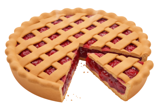 Delicious cherry pie with lattice crust isolated PNG, traditional dessert with a slice cut out on transparent background